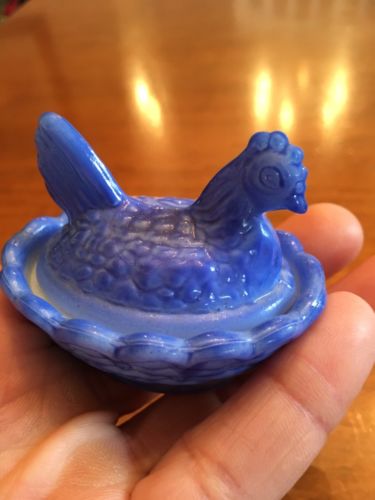 Title (ebay affiliate link): Vintage Art Glass Blue Hen on a Nest salt dip Westmoreland fired milk glass