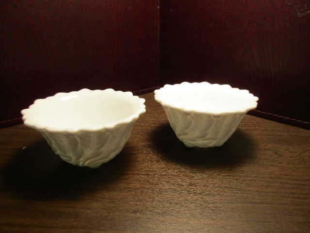 Title (ebay affiliate link): 2 Milk Glass - Custard Cups - Berry Bowls - Pressed - Floral - Leaf Pattern
