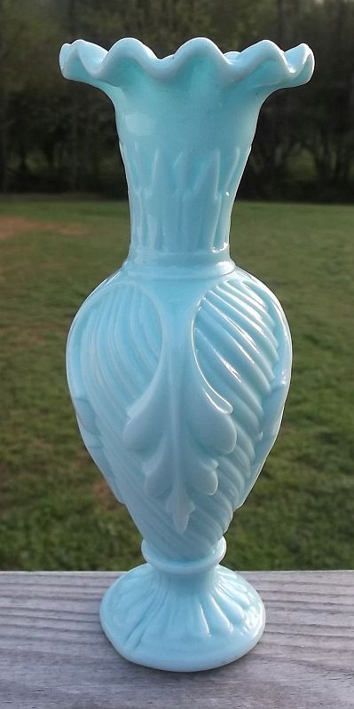 Title (ebay affiliate link): Vintage Portieux Vallerysthal BLUE Milk Glass 7.5 VASE Swirl Leaf Made in France