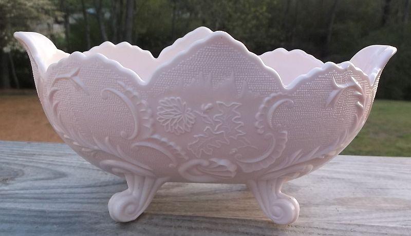 Title (ebay affiliate link): Jeannette SHELL PINK Milk Glass LOMBARDI Floral Four Footed 11" BOWL Stippled NR