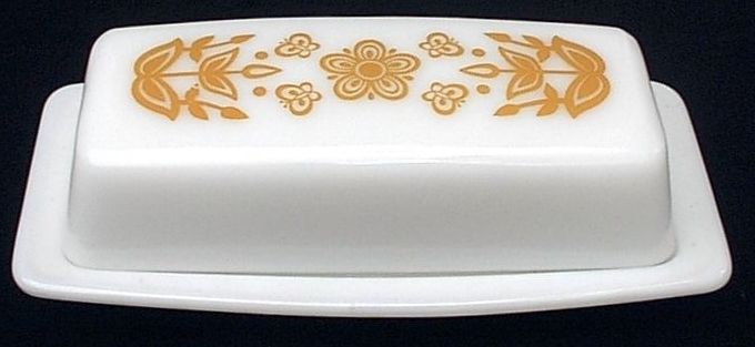 Title (ebay affiliate link): VINTAGE CORNING PYREX MILK GLASS BUTTER DISH BUTTERFLY GOLD PATTERN