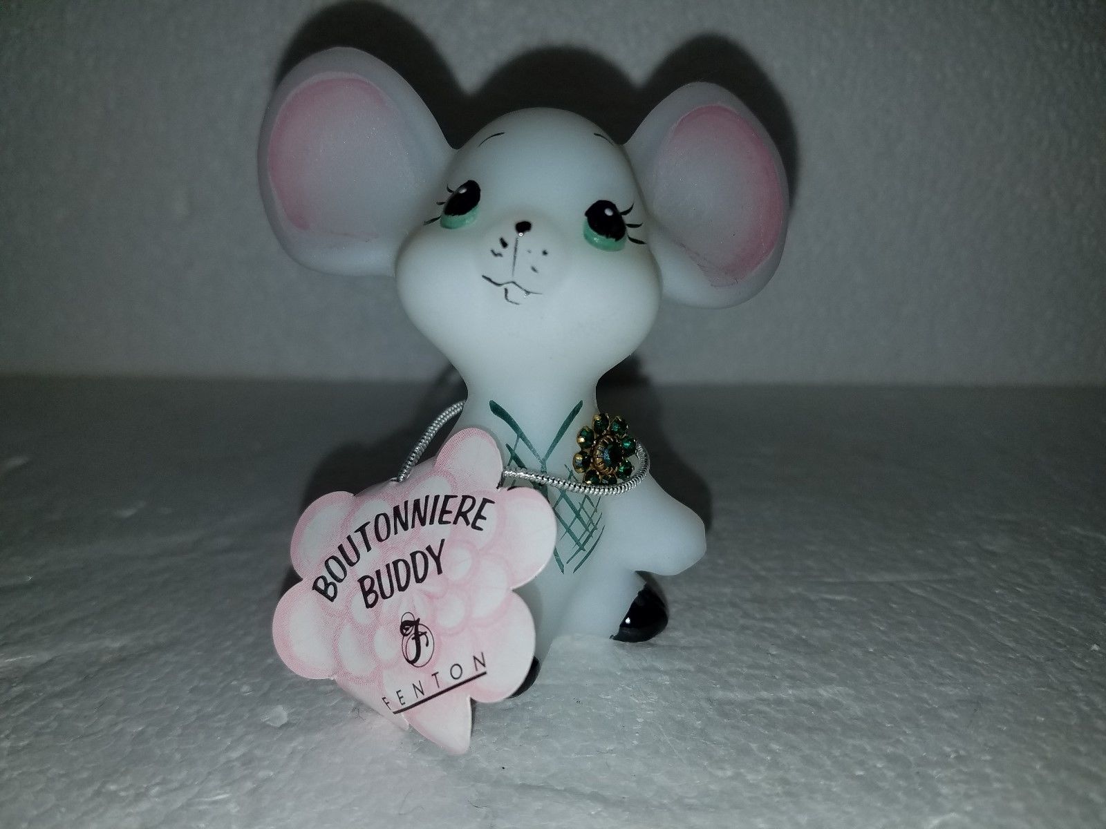 Title (ebay affiliate link): Vintage Hand Painted Fenton Milk Glass Mouse Boutonniere Buddy May w/Tag & Label
