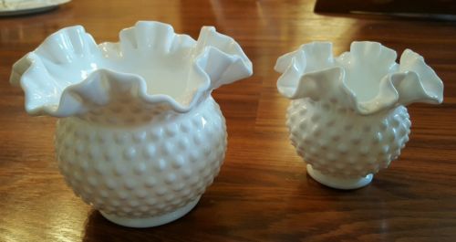 Fenton Milk Glass Hobnail Squat Vases - 2 pc lot