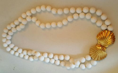 Title (ebay affiliate link): LES BERNARD MILK GLASS DOUBLE STRAND SHELL CLASP CAST NECKLACE SIGNED