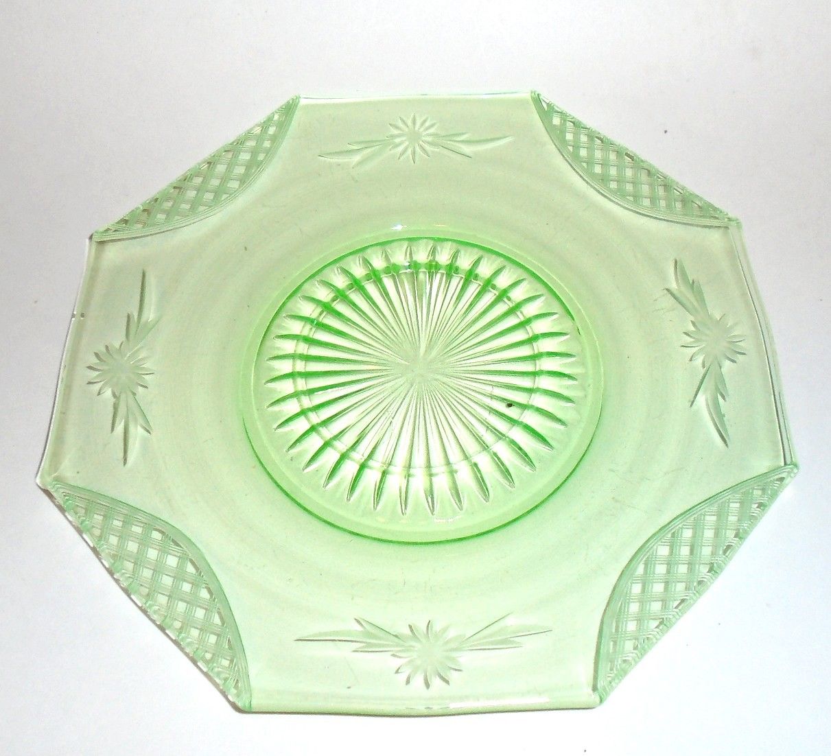 Title (ebay affiliate link): 9-3/4" Octagonal Green Vaseline Depression Glass Plate w Cut Floral and Lattice
