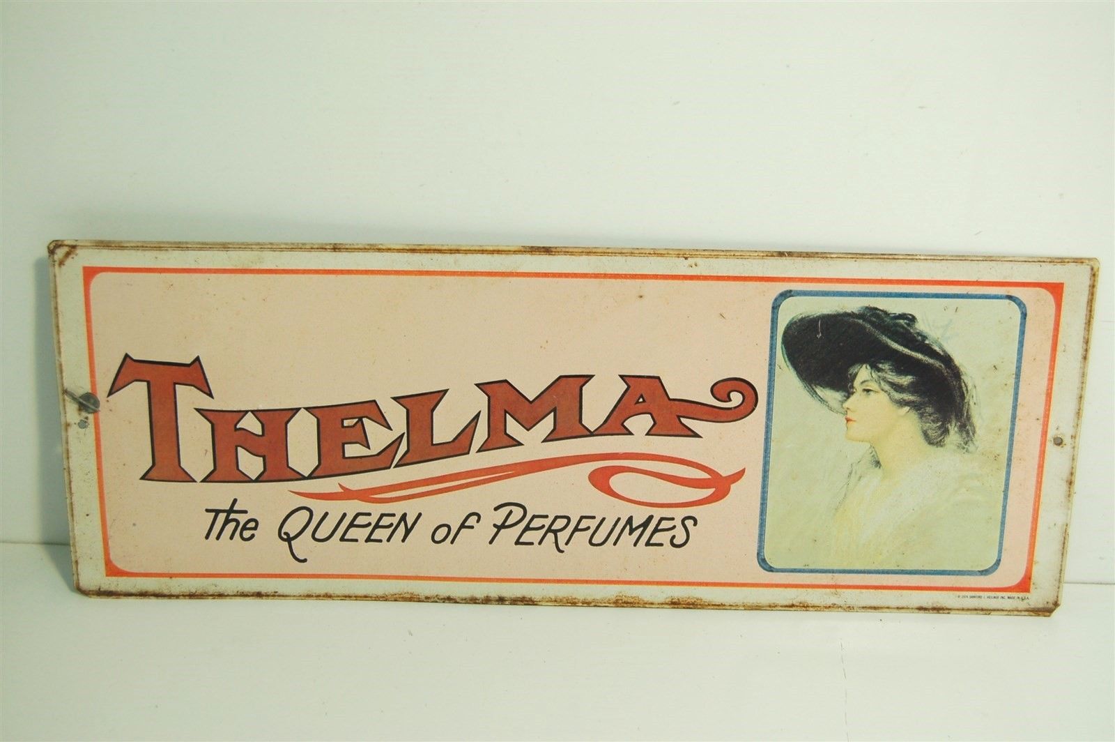 Title (ebay affiliate link): Vintage 1974 Thelma The Queen of Perfumes Metal Tin Sing 19" x 7"
