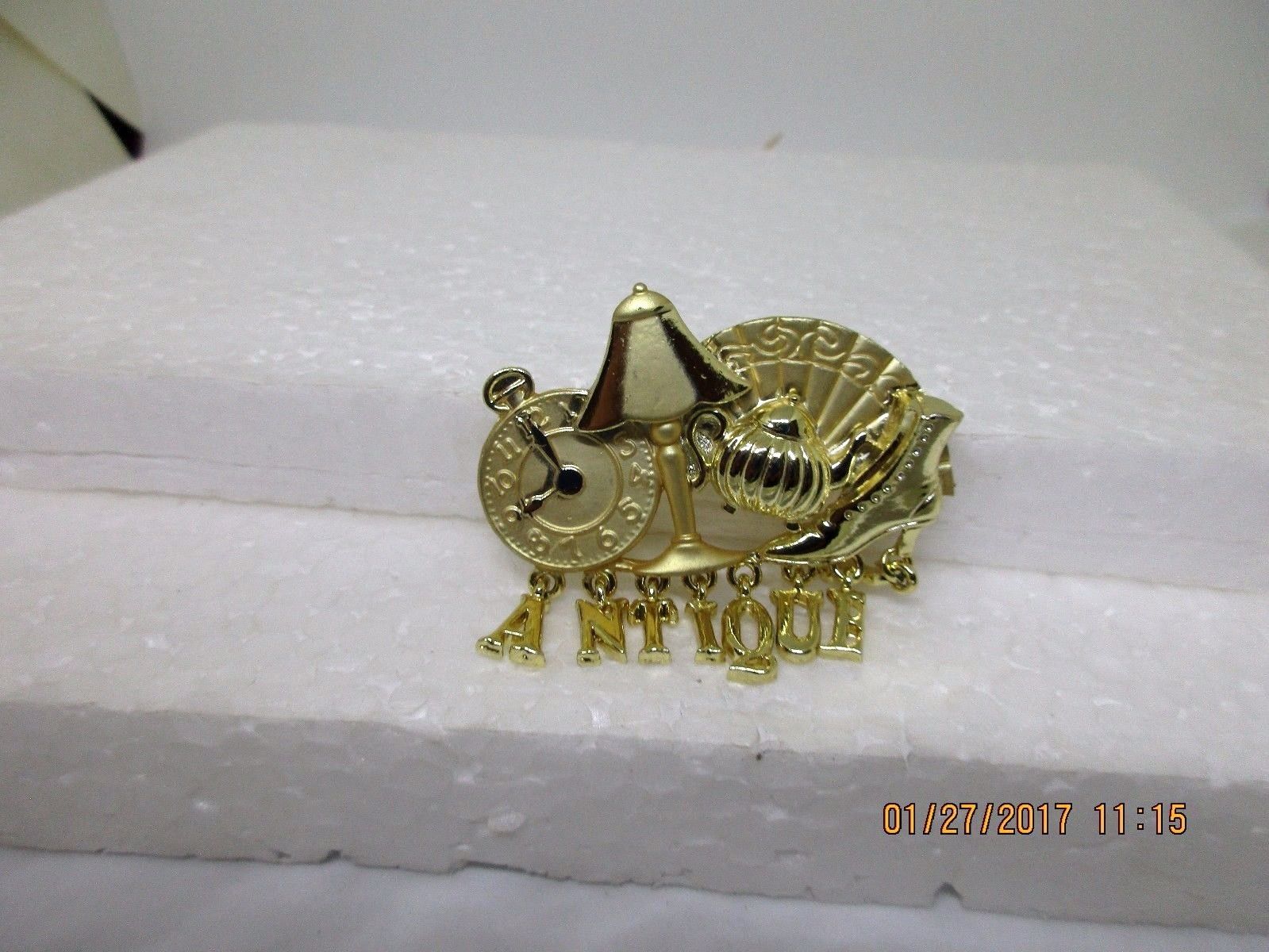Title (ebay affiliate link): AJC GOLD TONE 2" DANGLING "ANTIQUE" LETTERS CLOCK FAN LAMP TEAPOT METAL BROOCH