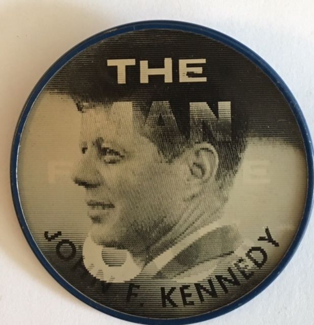 Title (ebay affiliate link): 2 1/2" JFK "The Man for the 60''s" Vari-Vue Flasher Pinback Button
