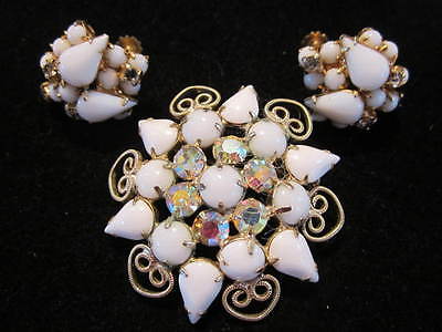 EXQUISITE!!!Vintage milkglass brooch & matching earrings-aurora borealis QUALITY