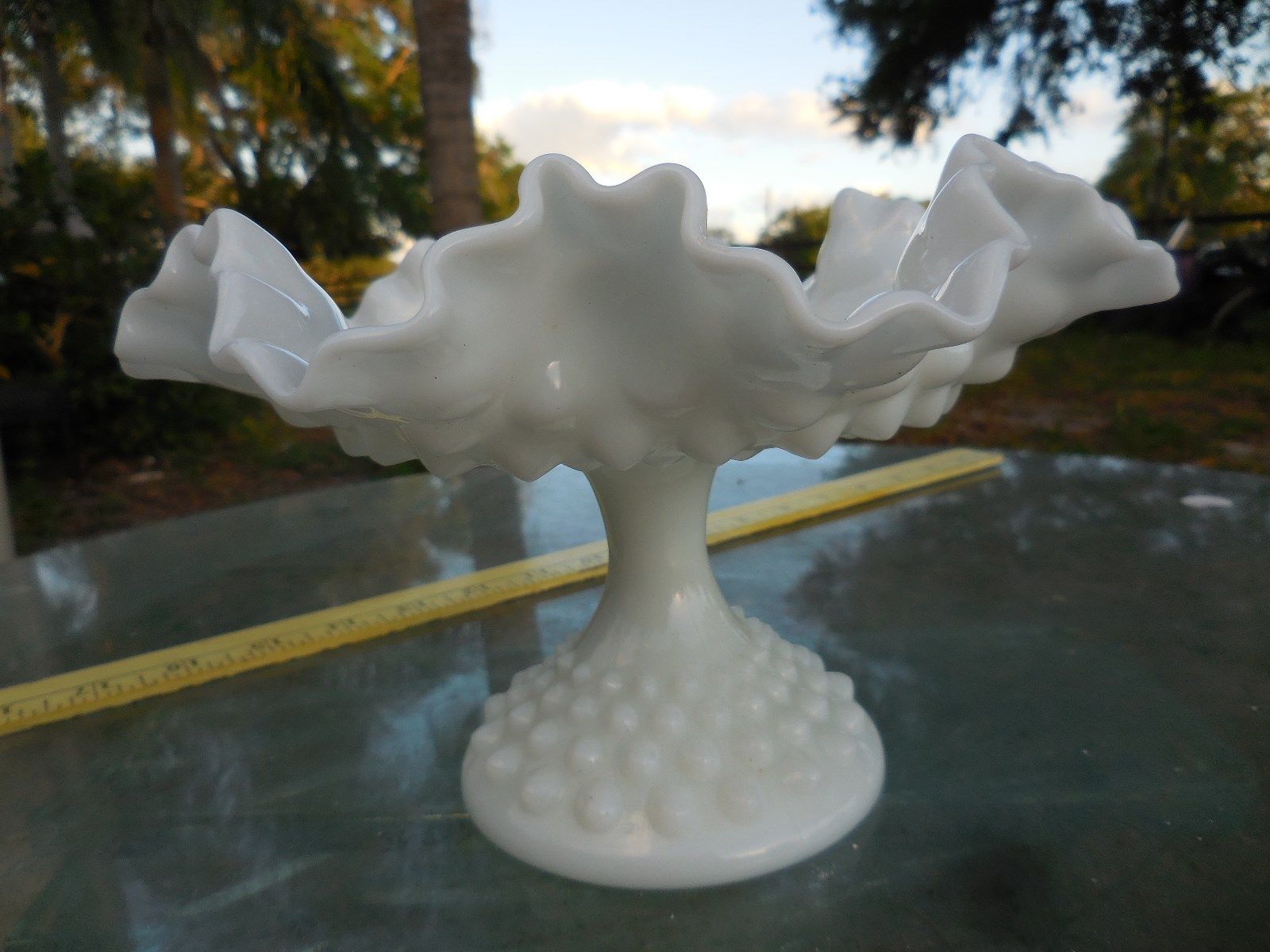 Title (ebay affiliate link): Vintage Fenton Milk Glass Hobnail Ruffled Pedestal Candy Dish Compote