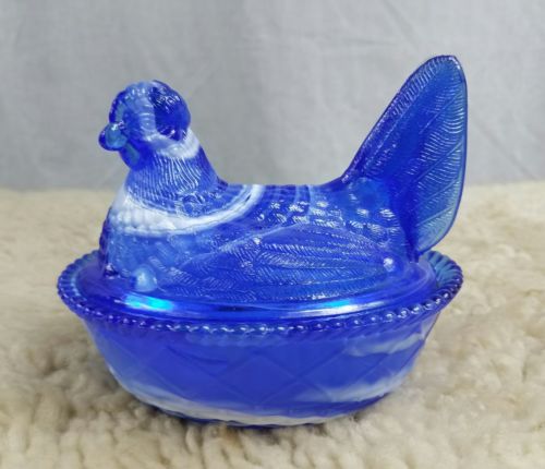 Title (ebay affiliate link): Westmoreland Blue Marble Swirl Milk Glass Hen On Nest 5.5" Cov. Dish Rare Color