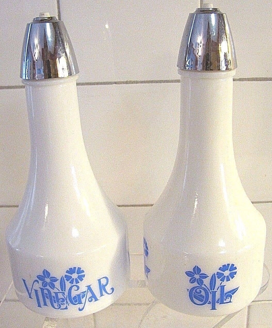Title (ebay affiliate link): Vtg Gemco White Milk Glass Blue Cornflower Vinegar Oil Cruets Silver Covers USA