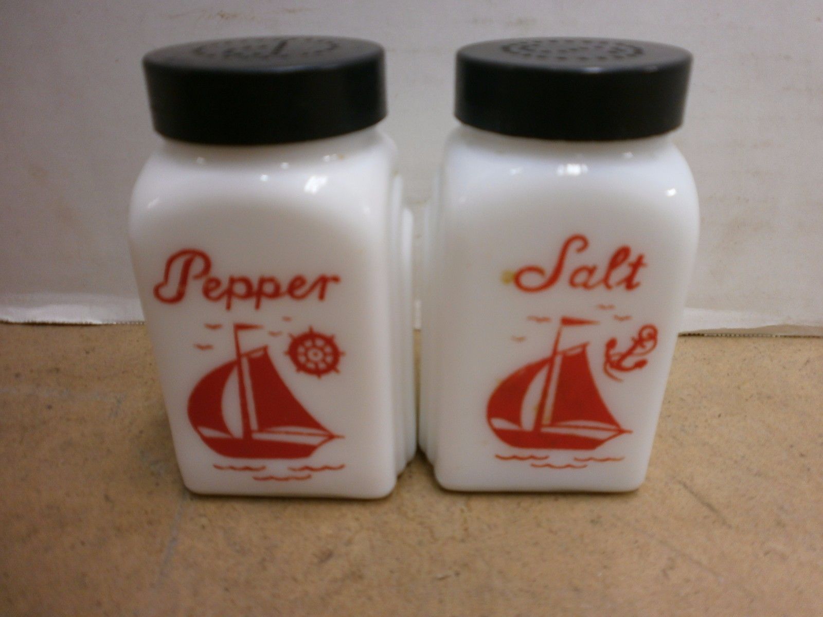 Vintage Milk Glass Salt & Pepper Shakers Red Sailboat