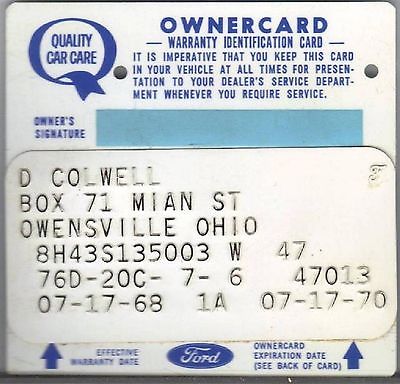 Title (ebay affiliate link): 1968 Ford Quality Car Care Owner Card Warranty ID Card