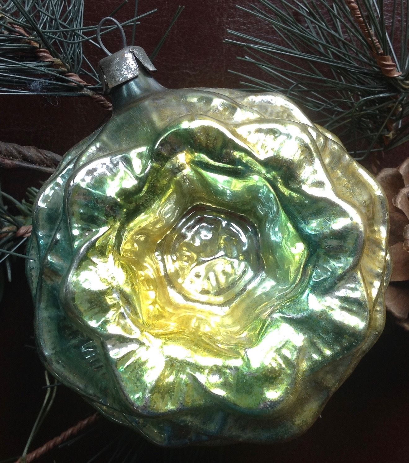Title (ebay affiliate link): VTG Mercury Blown Glass Green/Yellow Embossed Indent Flower Xmas Ornament-Nice!