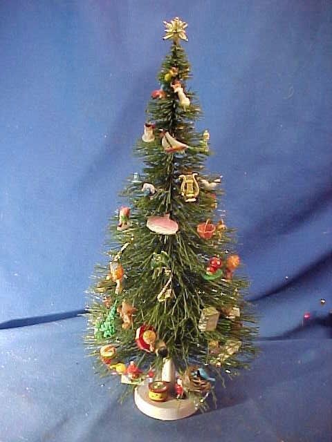 Title (ebay affiliate link): 1950s BOTTLE BRUSH Style CHRISTMAS TREE 13" Decorated w FIGURAL ORNAMENTS