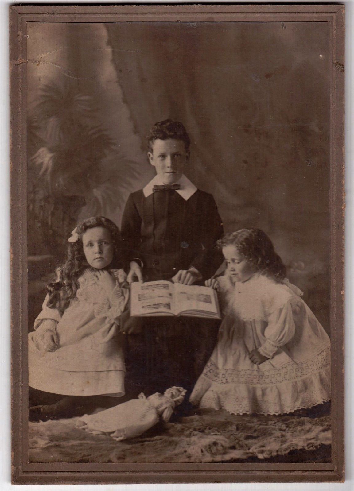 ANTIQUE CABINET CARD PHOTO YOUNG BOY AND 2 GIRLS HOLDING PICTURE BOOK & DOLL