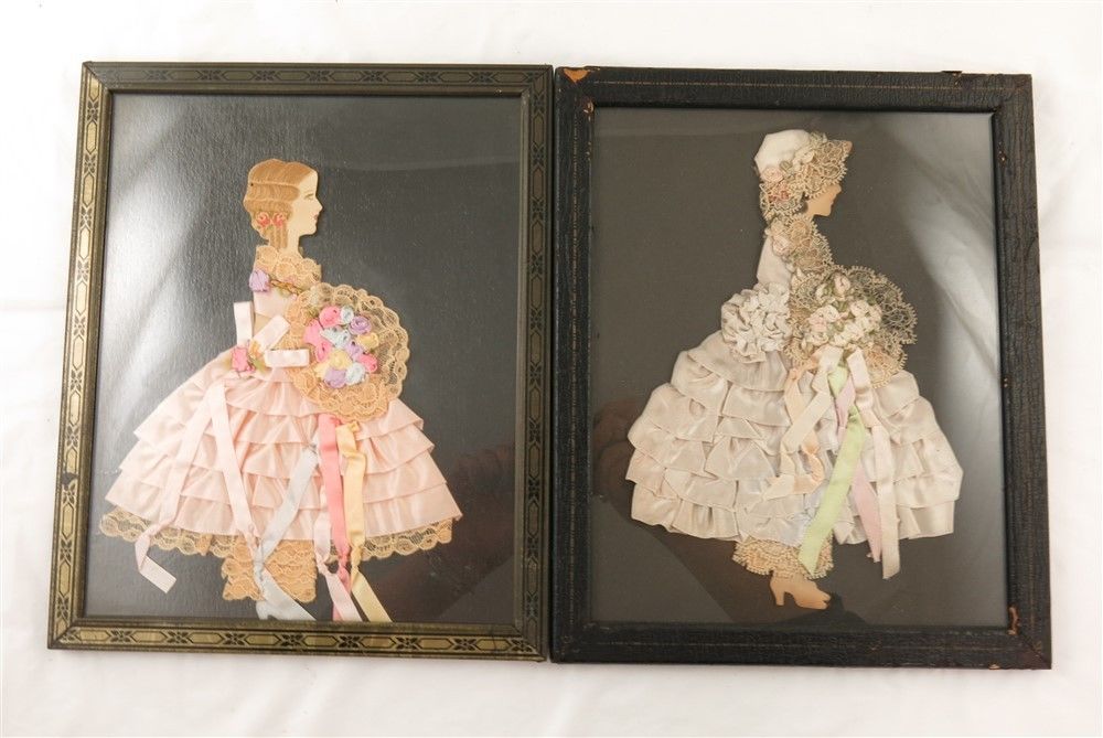 2-1920''s Art Deco Silhouette Paper Doll Ribbon Lace Dress w/ Bow & Flower Back