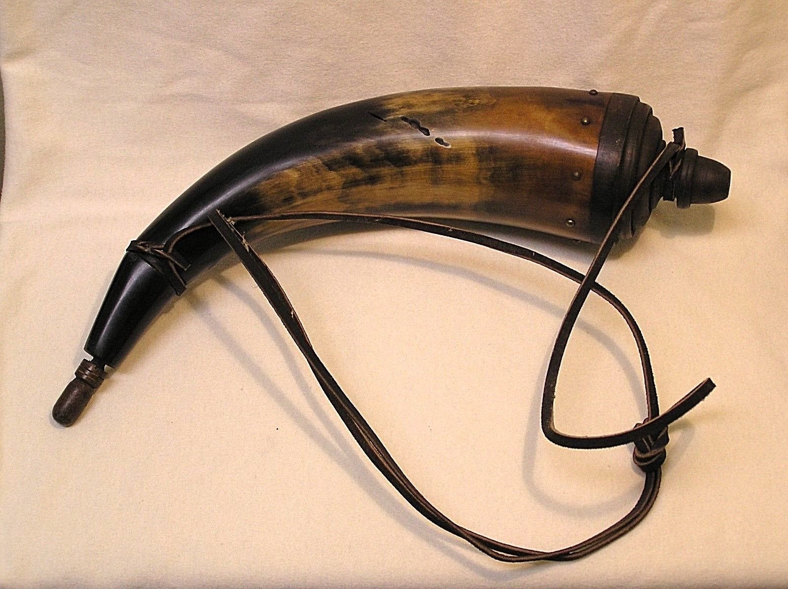 Title (ebay affiliate link): 16" vintage primitive POWDER HORN leather strap wood tips / brass studs