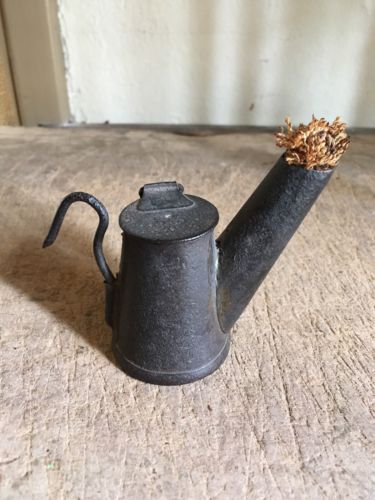 Title (ebay affiliate link): Early Antique Miners Hat Wick Oil Lamp Betty Lard Tin Lantern Lighting AAFA