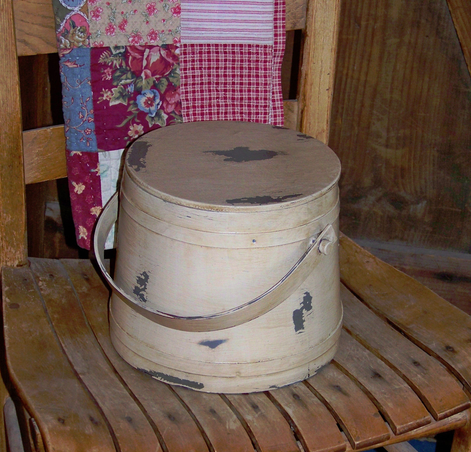 Title (ebay affiliate link): Primitive Painted Sugar bucket Firkin swing handle metal bands canted sides