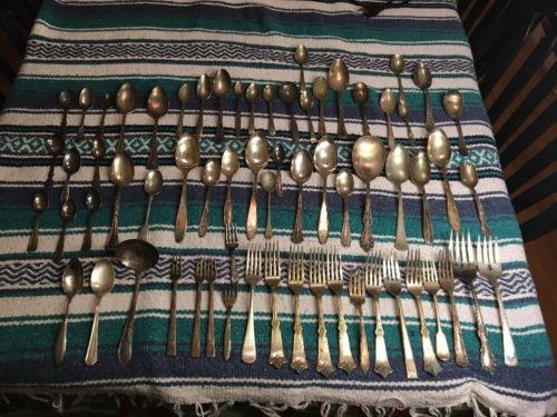 Title (ebay affiliate link): 65 Piece Silverplated Silver Plate Flatware Lot Spoon Fork Craft Jewelry Rings