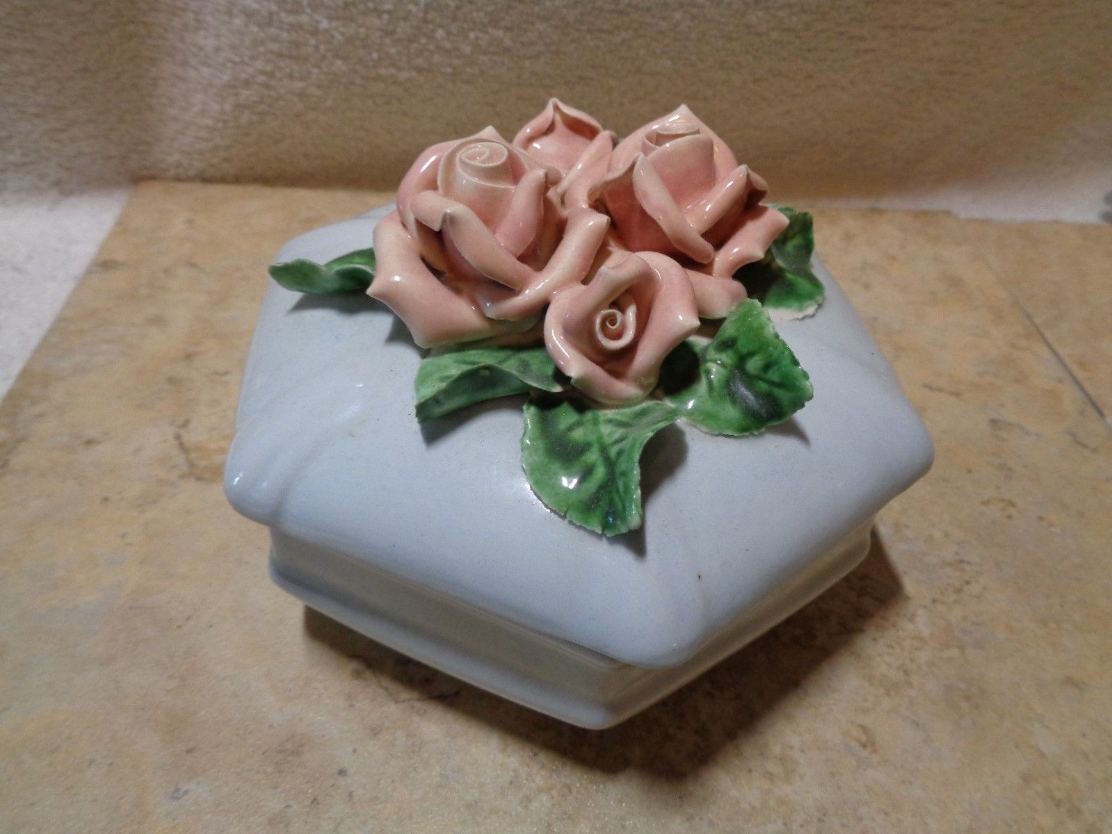 Title (ebay affiliate link): VINTAGE CAPODIMONTE 6 SIDED TRINKET DISH CANDY DISH PINK ROSES