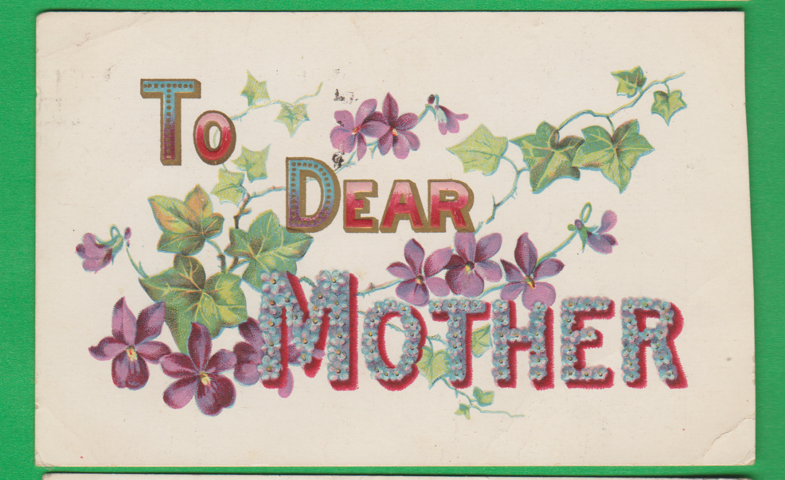 Title (ebay affiliate link): To Dear Mother/ ivy/ violets/ embossed greeting postcard