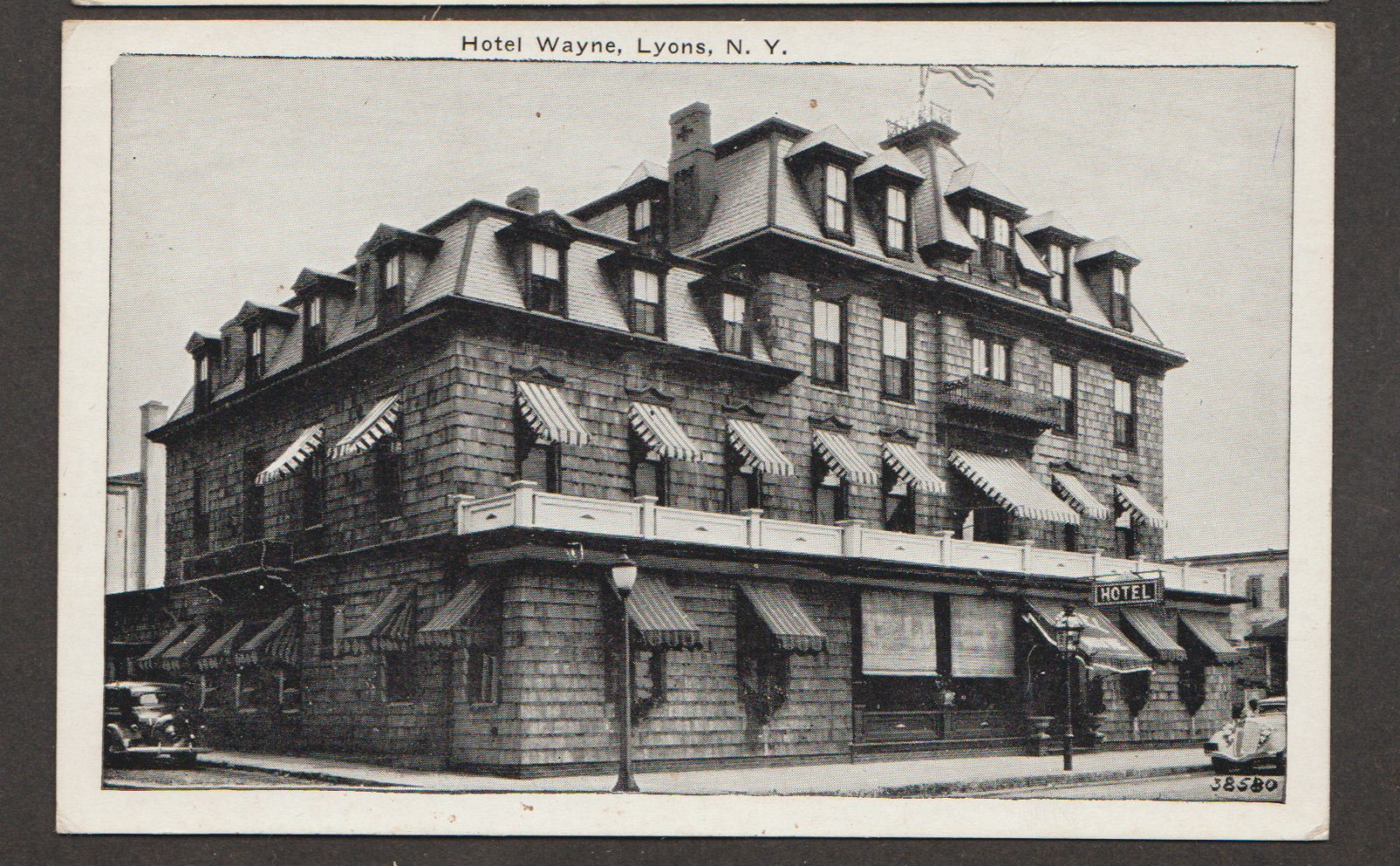 Title (ebay affiliate link): Lyons, NY/ Hotel Wayne/ old cars out front/ black and white photo postcard
