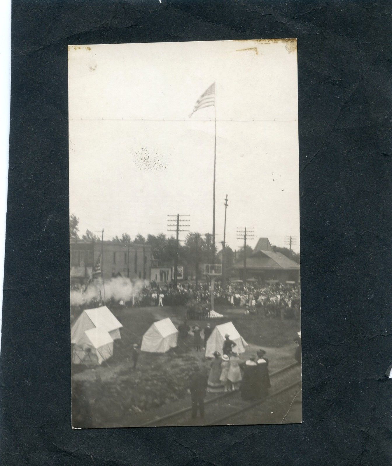 interesting early real photo postcard Train Depot, People, Tents, Smoke, US Flag