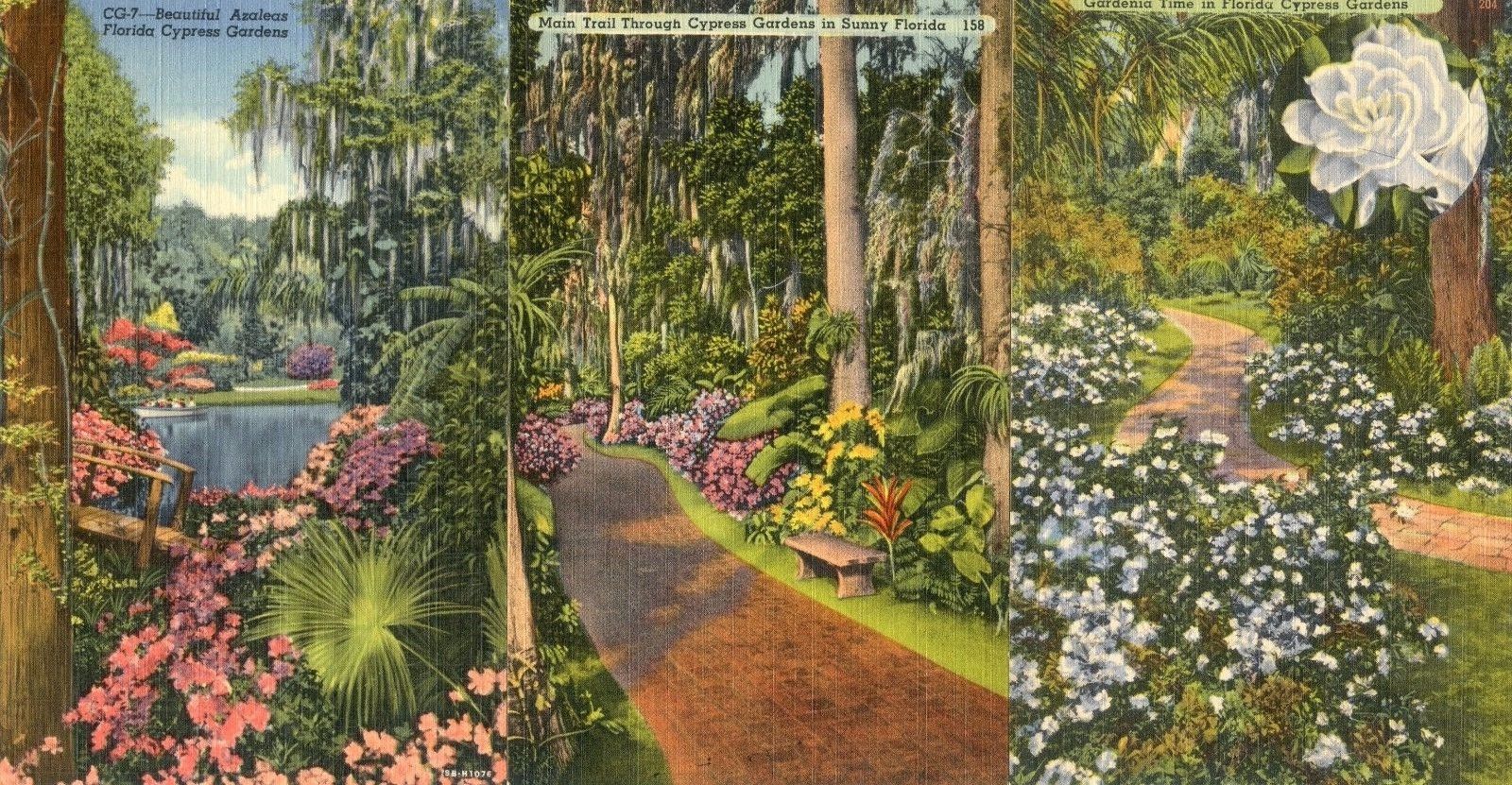 Title (ebay affiliate link): 3 Cypress Gardens Florida, vintage linen postcards, Gardenia, Main Trail, etc.
