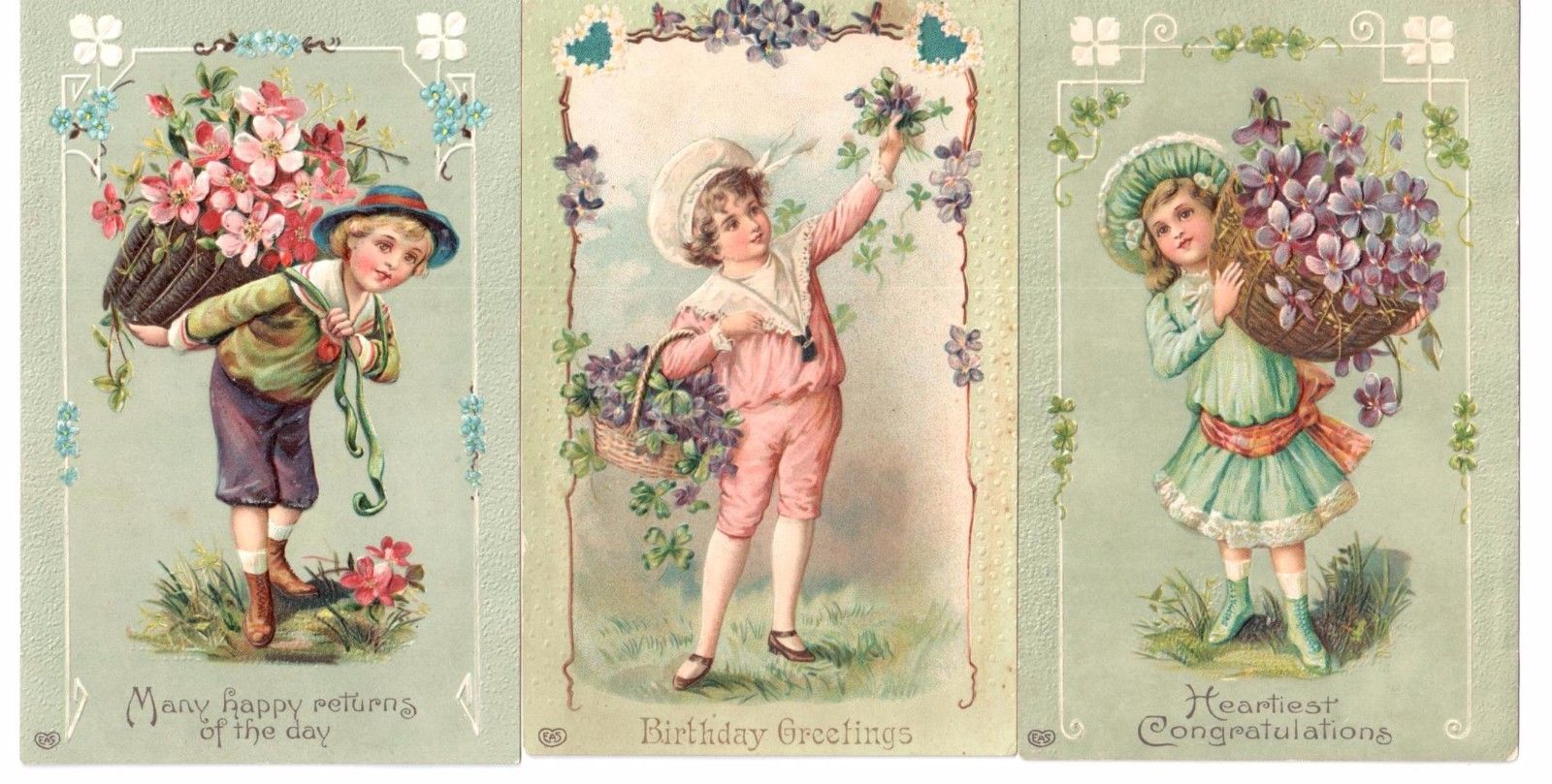 LOT: 3 EAS BIRTHDAY POSTCARDS CHILDREN BASKETS FLOWERS VIOLETS SHAMROCKS