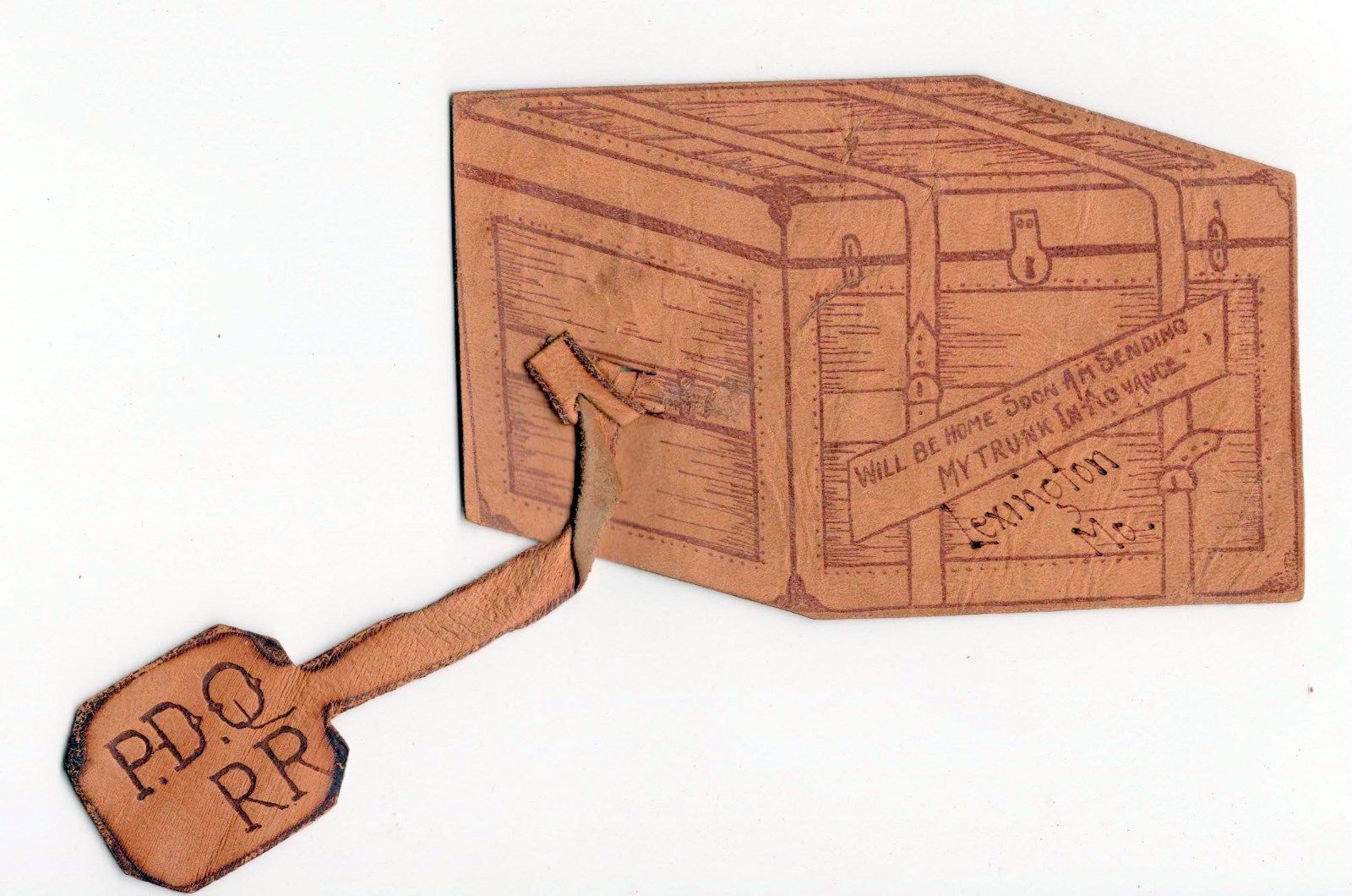 Title (ebay affiliate link): Vintage Trunk Shaped Leather pc SENDING MY TRUNK Lexington MO w/ P.D.Q. RR Tag