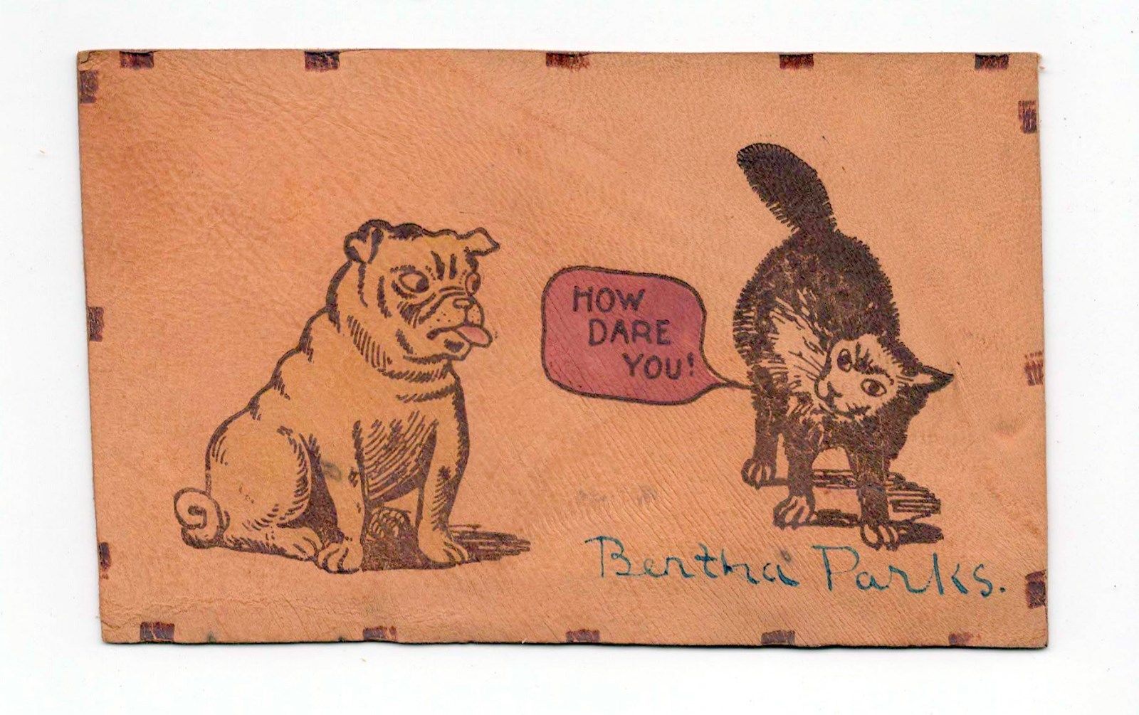 Title (ebay affiliate link): Vintage Leather pc Dog Sticking Tongue Out at Cat HOW DARE YOU Lexington MO 1907