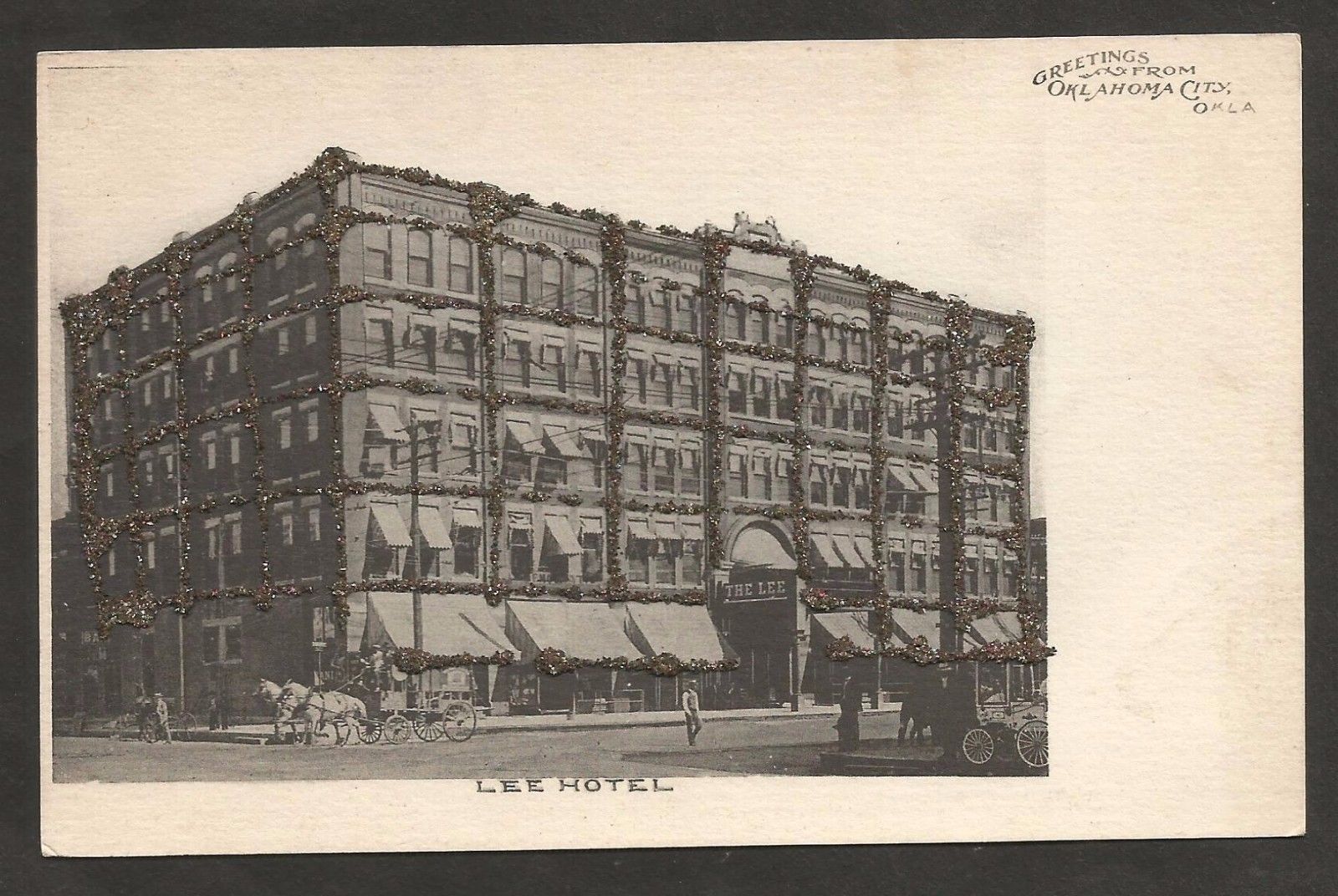 Vintage Postcard Greetings Oklahoma City, Lee Hotel at Main & Broadway, Glitter