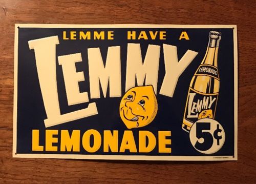 Title (ebay affiliate link): Lemme Have a Lemmy - Reprint vintage ad tin sign for Lemonade Beverage