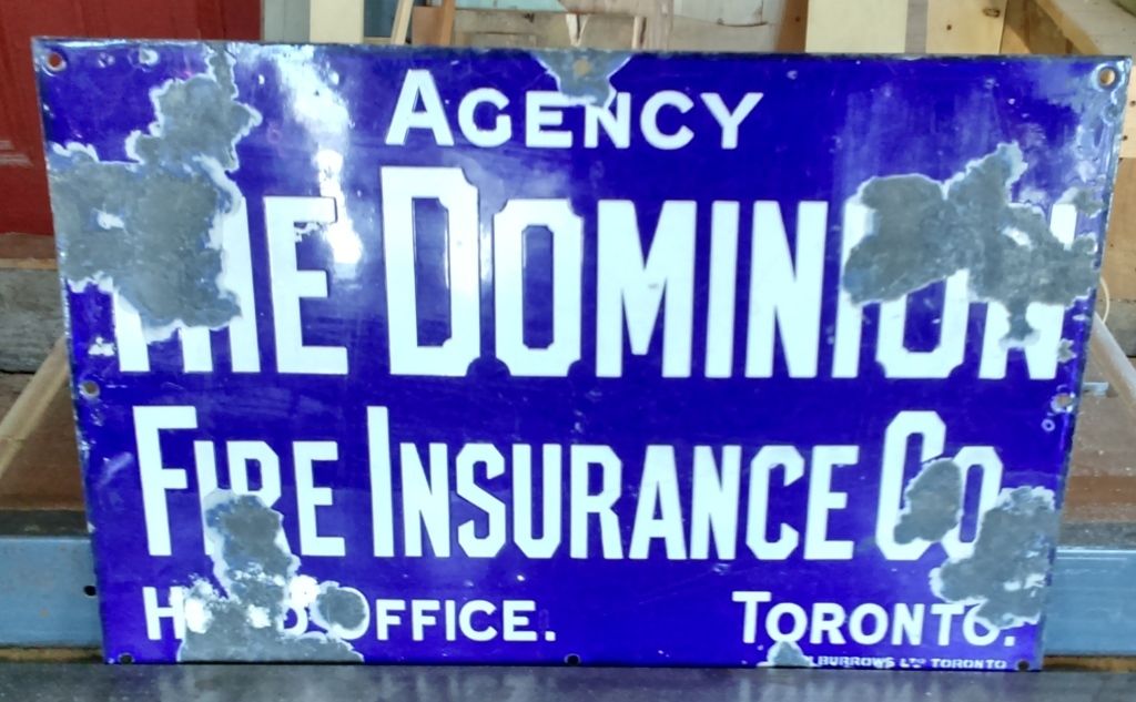 Title (ebay affiliate link): PORCELAIN SIGN AGENCY The DOMINION FIRE INSURANCE COMPANY TORONTO Tin no tobacco