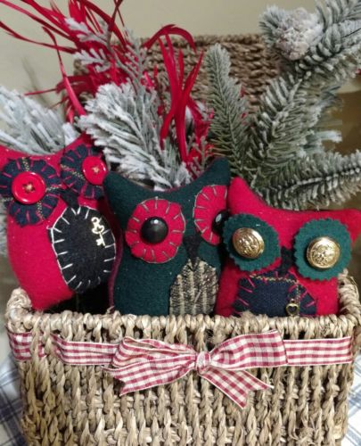 Title (ebay affiliate link): Primitive HOOT OWL trio bowl fillers, ornies, shelfsitters, wool & buttons
