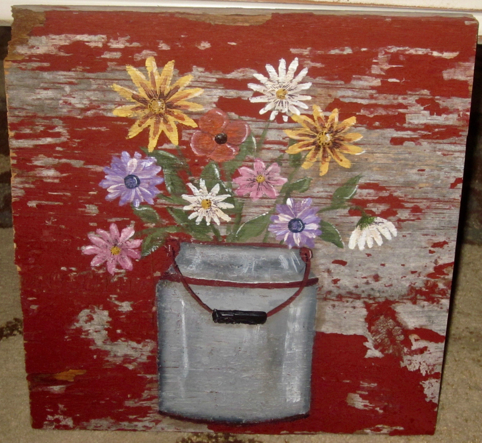 Title (ebay affiliate link): *~*PRIMITIVE*~* HP FOLK ART PRIM PAIL OF WILDFLOWERS *~* OLD RECLAIMED BARN WOOD