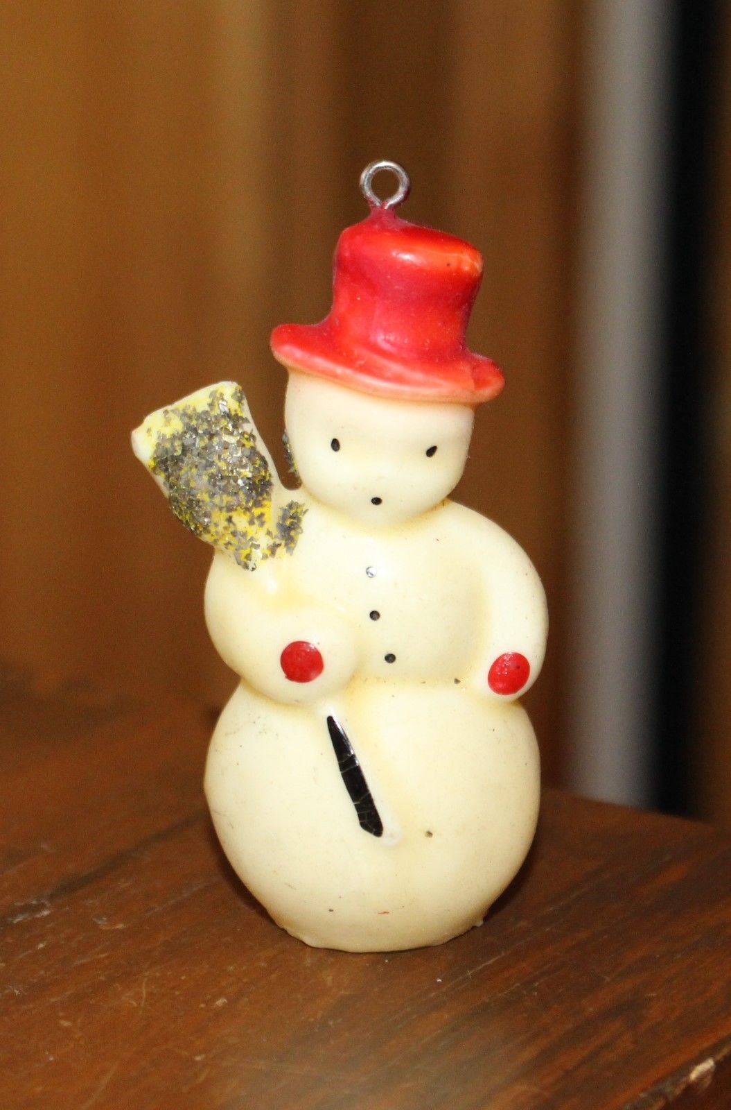 Title (ebay affiliate link): Wax Snowman, Red top hat, Broom in hand. Metal insert in top. U.S.A. 1930s