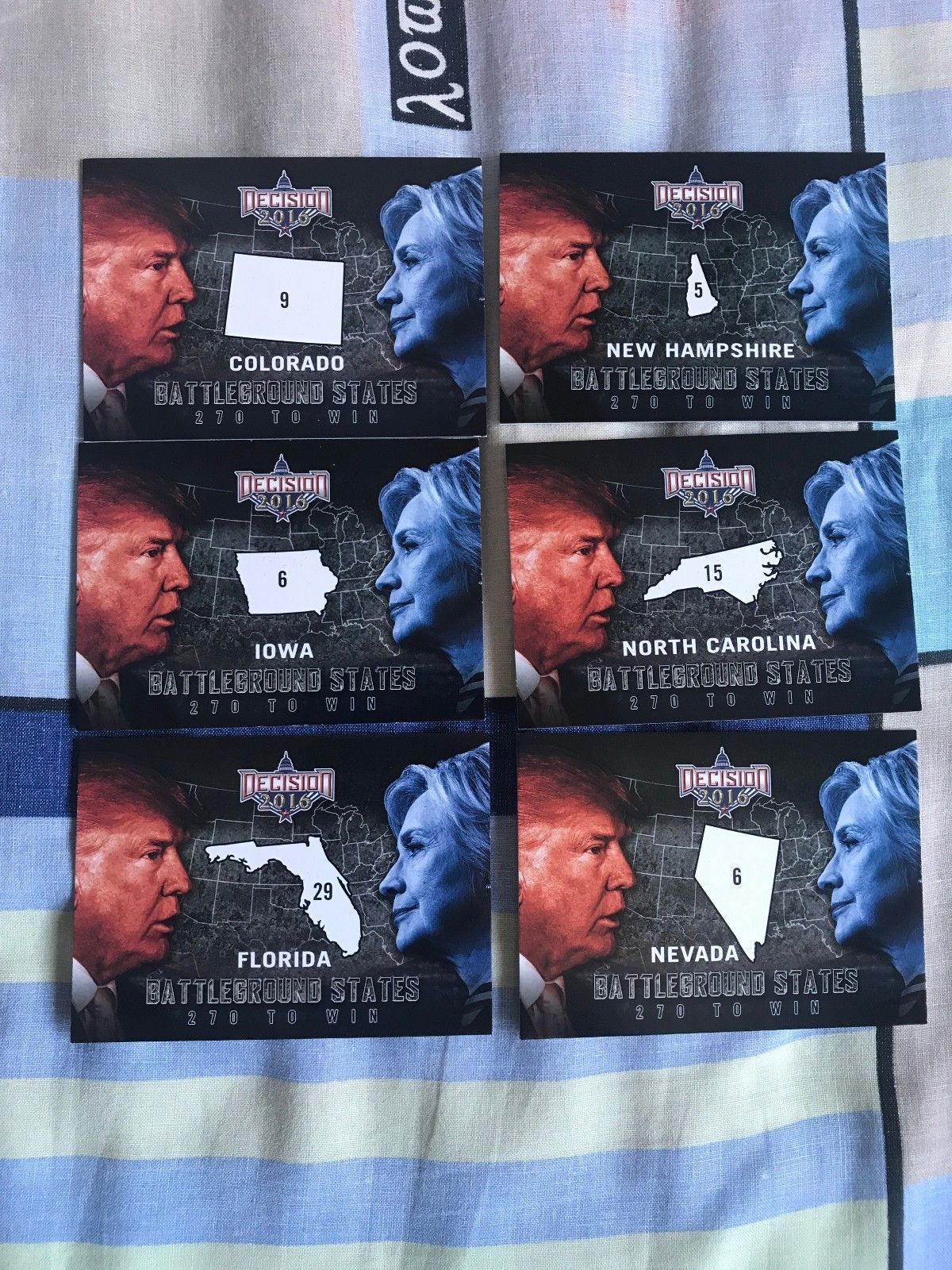 Title (ebay affiliate link): (6) 2016 LEAF Decision 2 BATTLEGROUND STATES DONALD TRUMP VS HILLARY CLINTON HOT