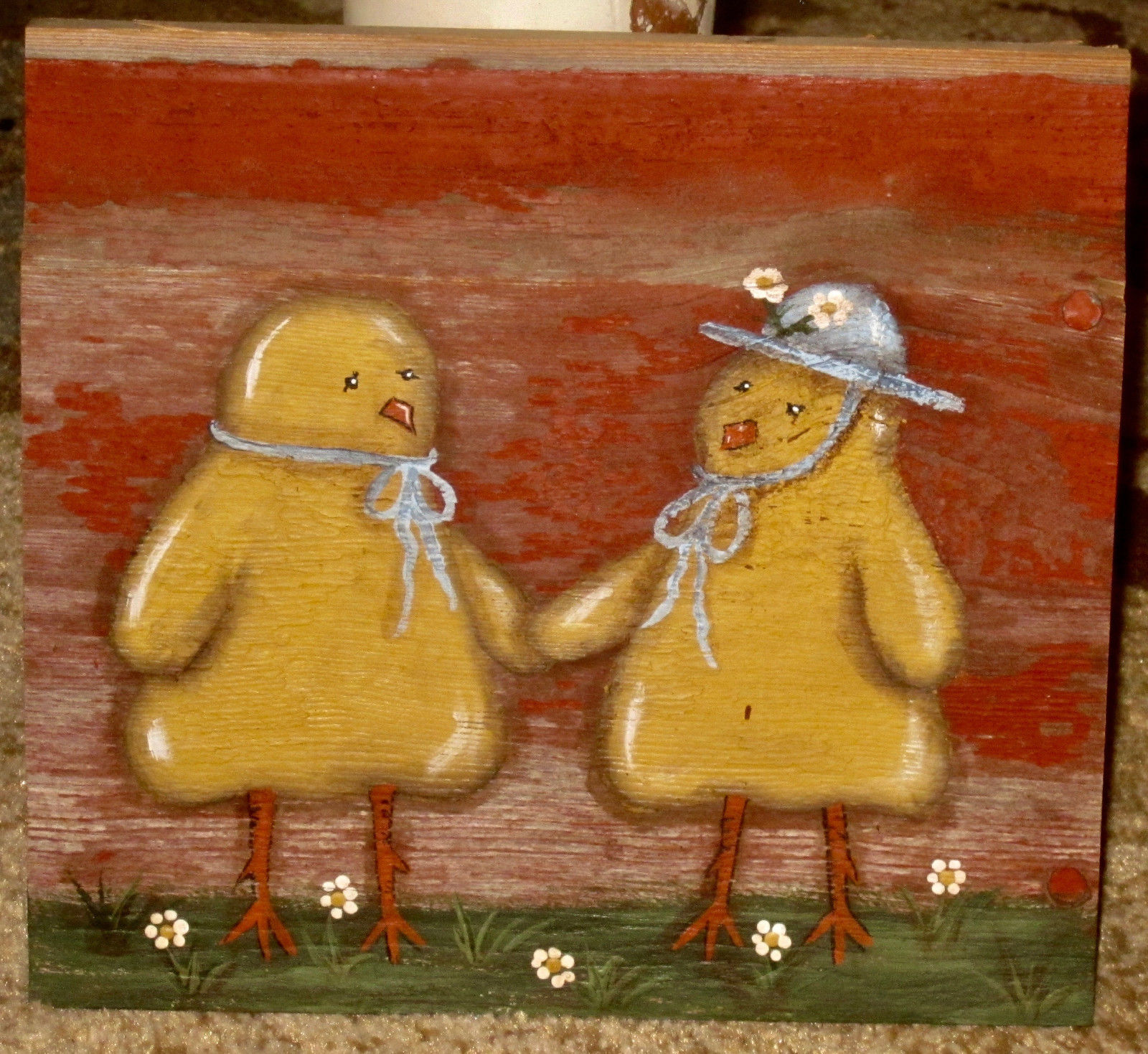 Title (ebay affiliate link): *~*PRIMITIVE*~* HP FOLK ART PRIM CHICK COUPLE *~* EASTER *~*OLD RECLAIMED WOOD