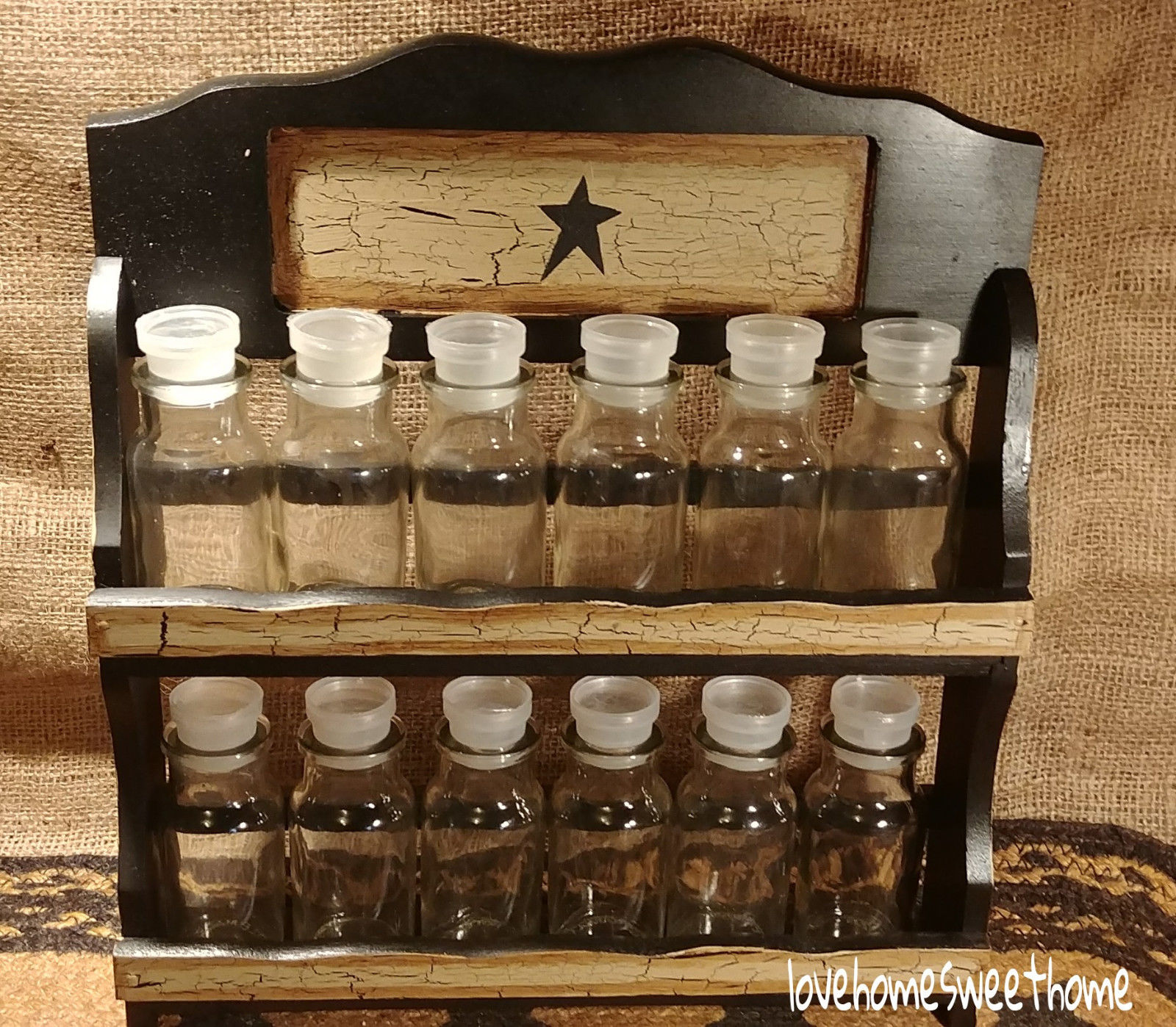 Title (ebay affiliate link): Primitive Crackle Tan & Black Star Wood Spice Rack & Glass Spice Bottles