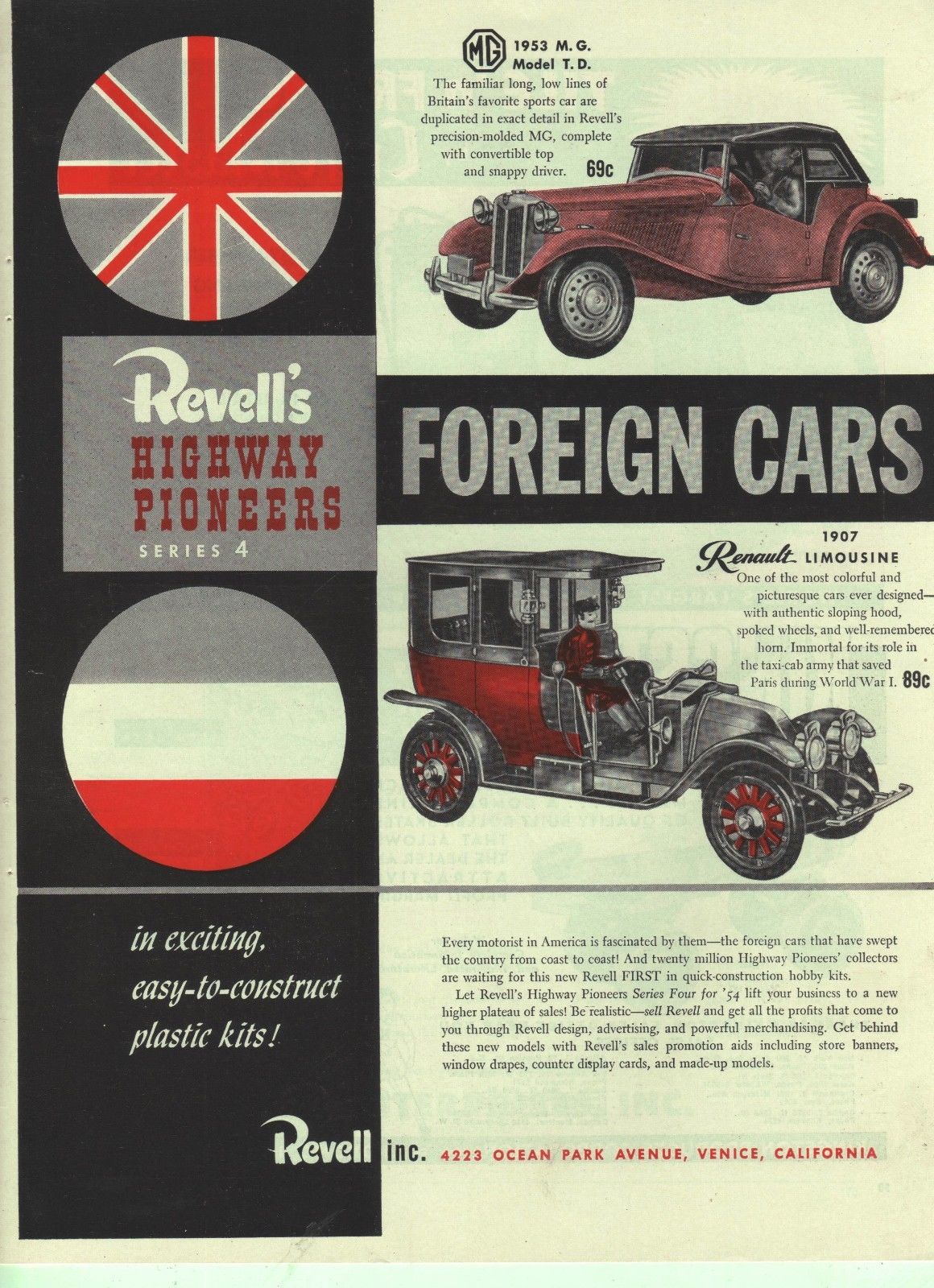 1954 Revell''s Highway Pioneers 1953 M.G Model T.D. 1907 Renault Limousine Toy Ad