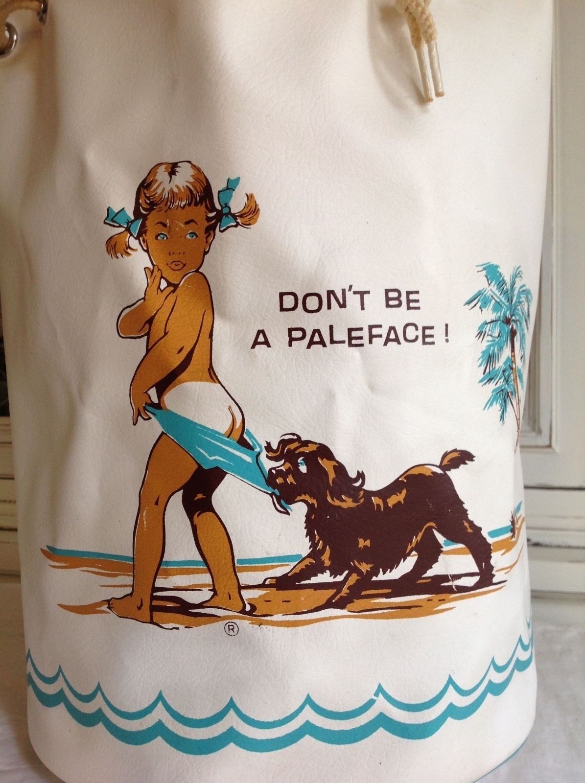 VINTAGE 1960''S COPPERTONE SUNTAN LOTION VINYL DRAWSTRING BEACH BAG DONT BE A PF
