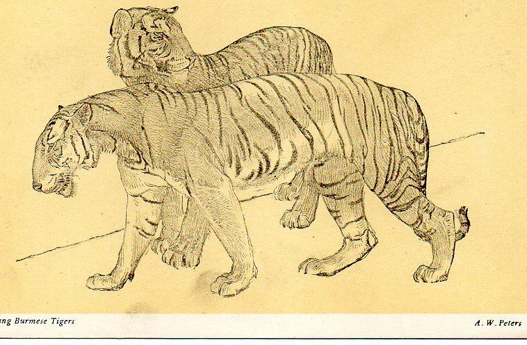 VINTAGE A&C BLACK THE ZOO series postcard of YOUNG BURMESE TIGERS by A W Peters