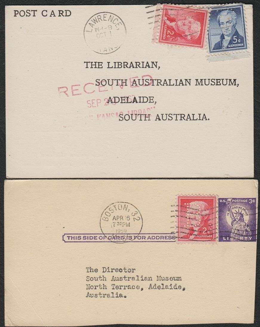 k2464) 2 x POSTCARDS FROM USA TO SOUTH AUSTRALIA 1958 & 1962 THANK YOU