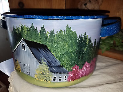 Title (ebay affiliate link): Blue enamel pot hand painted spring barn scene (1112201618)