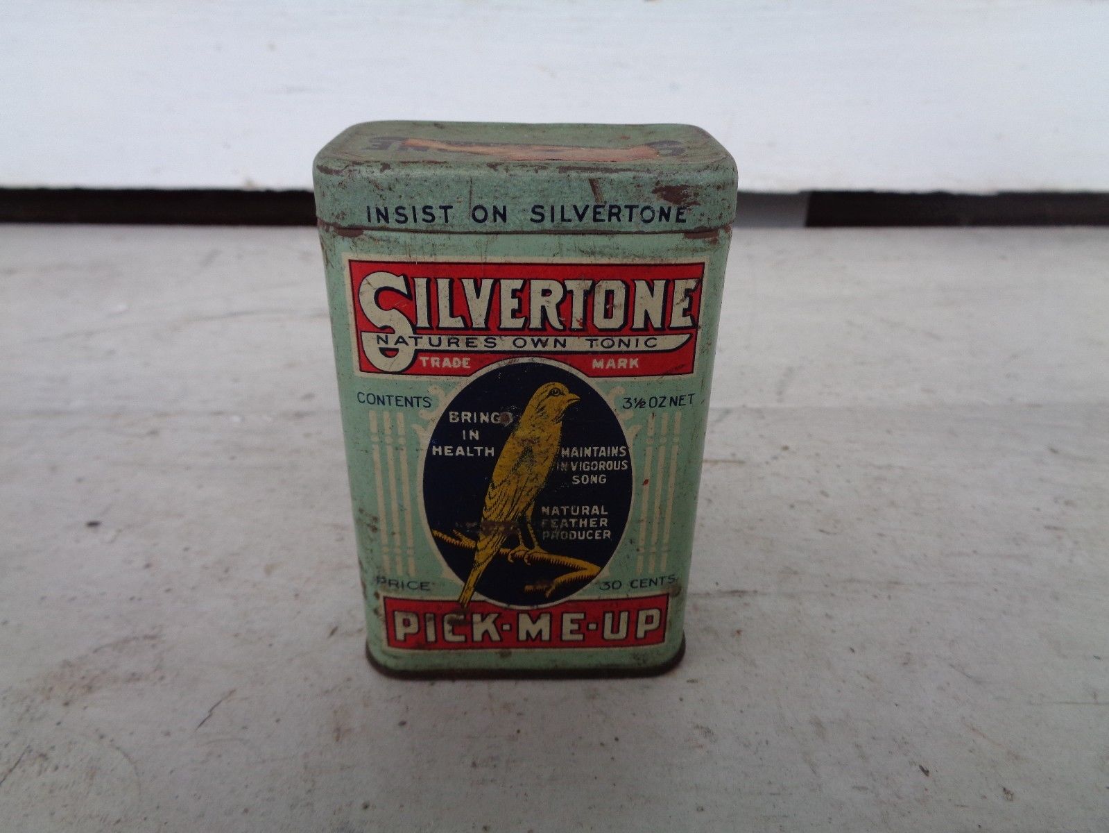 VINTAGE SILVERTONE PICK ME UP BIRD FOOD TIN CAN NY FISH ADVERTISING FARMHOUSE
