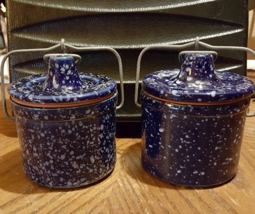 Pair of Vintage Blue Speckled Cheese Butter Crocks - with latch